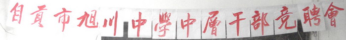 2008年7月8日下午,我校中层干部竞聘会在阶梯教室召开,全校教职员工准时参加了竞聘会。区教育局党委委员、纪委书记艾仁章、区教育局党委委员、党政办主任刘永红两位领导也到校参加了会议。竞聘会上,竞聘者发表了激情洋溢的竞聘宣言。(党政办)