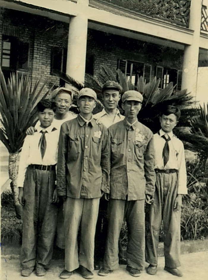 《旭川中学首批入团的少先队员与辅导员合影》原照片由初24班校友覃守欽提供。其中(从左至右)第一排:曾世农(初26班)、梁志忠(初24班)、余志祥(初24班)、李应寿(初24班)。第二排:杨成芝(女、初24班)、杨贵朝(初23班)、曾祥仁(初25班)、覃守欽(女、初24班)第三排刘名一(大队辅导员)、刘名鉴(中队辅导员)