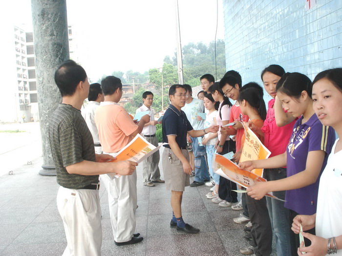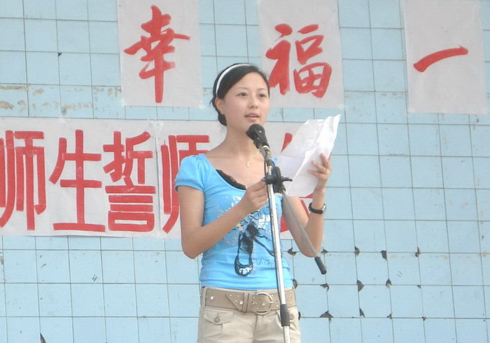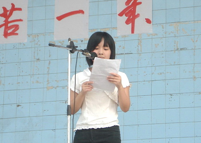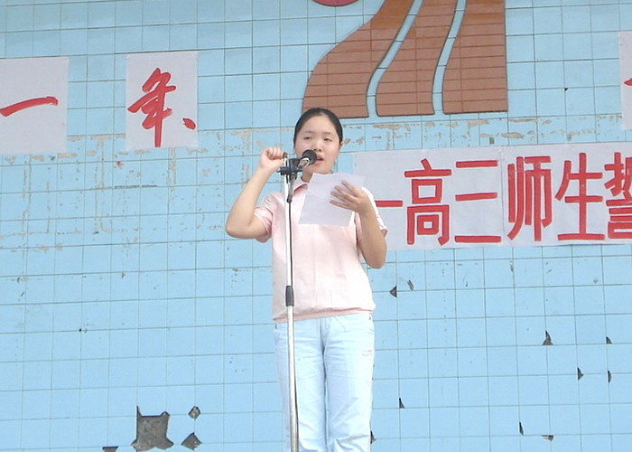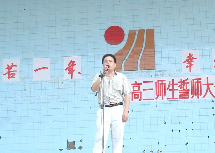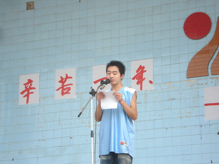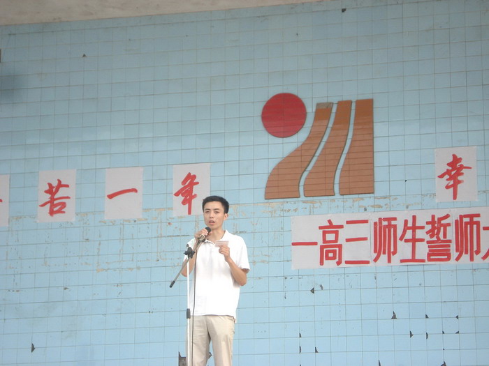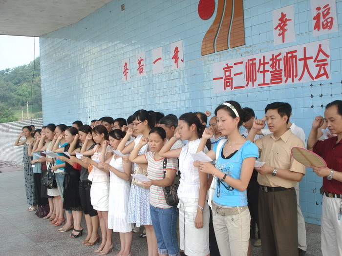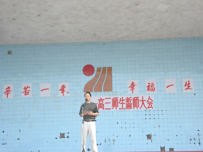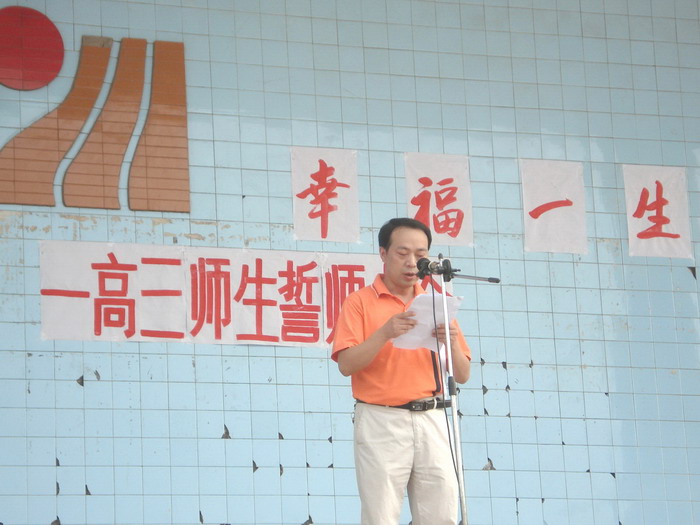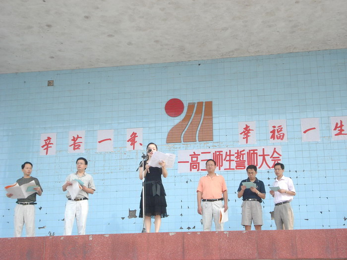 2008年7月12日,我校高2009级全体师生在运动场举行了“辛苦一年、幸福一生”高三师生誓师大会,校长李卫东、工会主席徐健、分管副校长冯丹东、副校长何高明、副校长罗勇等校级干部参加了大会。大会上校长、分管校长、教师代表、家长代表和学生代表都分别做了演讲,最后全体高三教师进行了宣誓。