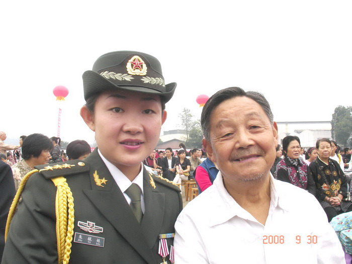 校友朱毓姝(左)(十七大代表,成都军区某通讯连指导员)与班主任易俊哲(右)参加校庆活动