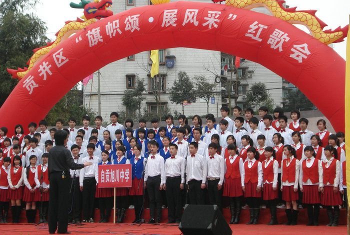 下午,我校学生合唱团参加了贡井区委宣传部组织的“旗帜颂·展风采”红歌会,他们热情洋溢的演唱受到了在场群众的好评。