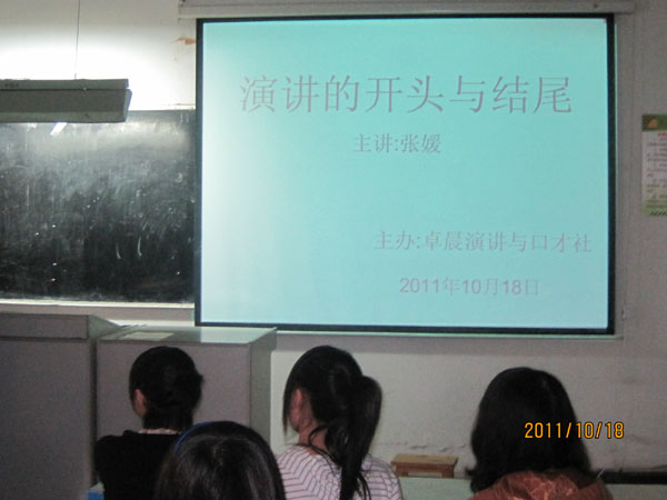 中午,我校卓晨演讲与口才社的指导老师张媛在多媒体教室为社员们举行了一场题为《演讲的开头与结尾》的专题讲座。