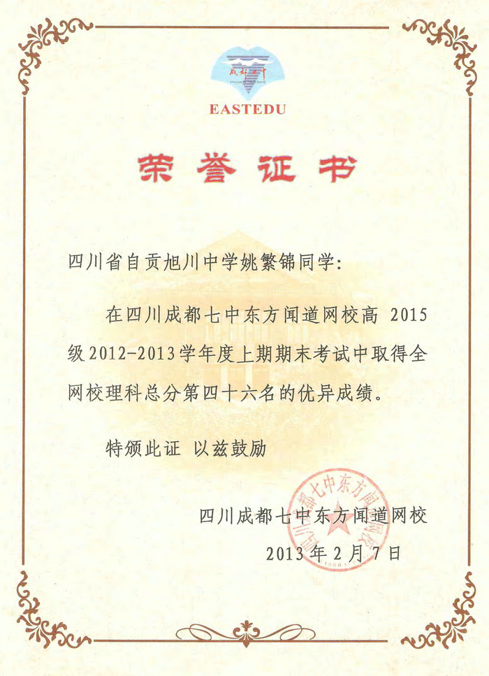 我校高2015届1班黄雅玲、6班姚繁锦两位同学在成都七中东方闻道网校2012—2013学年度上期期末考试中分别取得全网校文科总分第六名和理科总分第四十六名的优异成绩,获得网校颁发的荣誉证书。