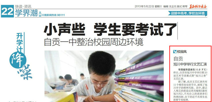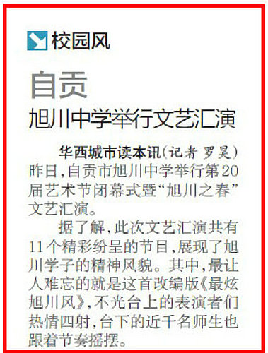 转自2013年5月22日《华西城市读本》22版——旭川中学举行文艺汇演。