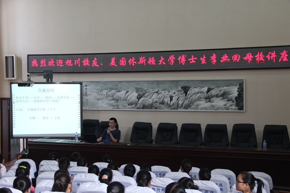 旭川中学高2002届校友、美国休斯顿大学博士生李业回母校为高2016届直播班学生做励志讲座。