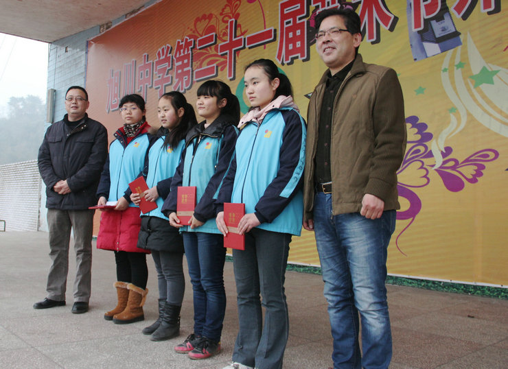 学校领导与受表彰学生合影(左起:冯丹东校长、黄雅婷、李雅欣、陈思、吴馨悦、毛德君副校长)