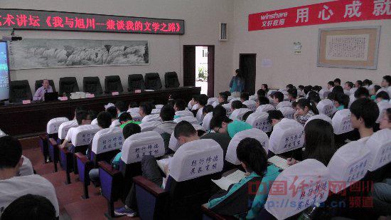 我是旭川的学子,曾在旭川念书,后来在三十中任教,在自贡电瓷厂工作,再后来回到旭川中学工作。教书、办工厂和办公室工作。创建了文学社,办了社刊《雏凤》,给旭川好几届的同学都讲过文学,也给市内好几所中学讲过文学。今天回来看见这么多的同学听讲,特别高兴,看到了旭川文学的传承和希望……在我指导文学社的几年中,有许多爱好文学的优生。