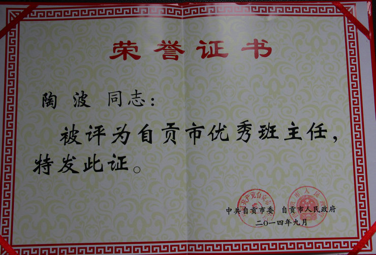 大会通报了全市获得全国先进集体、优秀教师及教育工作者、省特级教师等荣誉称号情况,宣读了市委、市政府关于表彰自贡市优秀教师、优秀班主任和优秀校长的通报,并向获奖人员代表颁发证书。我校党总支书记、校长冯丹东喜获自贡市优秀校长荣誉称号,我校教师龚智鹏、陶波分别获得自贡市优秀教师和优秀班主任荣誉称号。
