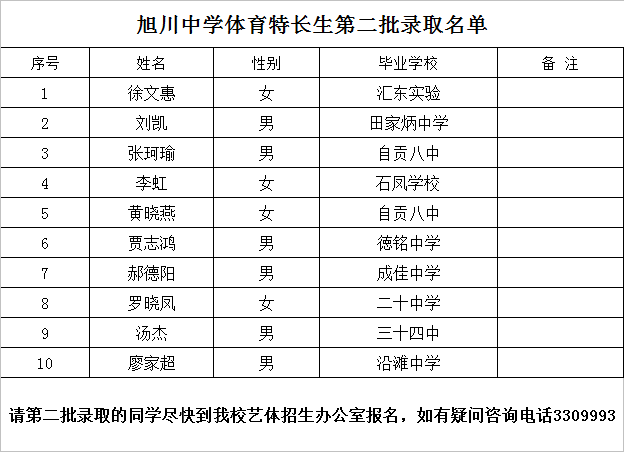 自贡市旭川中学2015年艺体招生第二批次录取名单