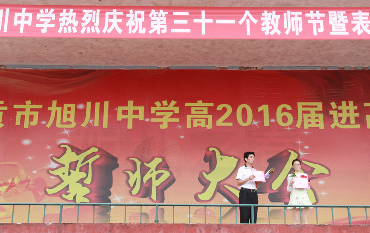 旭川中学党总支书记校长冯丹东为老师节致辞党总支副书记、工会主席徐健宣读表彰决定。学生代表以讲故事和诗朗诵的形式赞扬了无私奉献的老师们,并代表全体同学祝老师节日快乐。