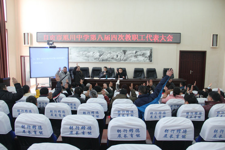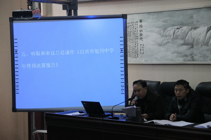 大会听取、审议并表决通过了学校行政办主任李林所作的《自贡市旭川中学奖励性绩效工资分配方案(修订稿草案)》、《自贡市旭川中学年级组奖励性绩效工资考核方案(修订稿草案)》、《自贡市旭川中学请假制度(草案)》、《自贡市旭川中学初中教育教学成果奖方案(草案)》;听取和审议了学校副校长吕廷康所作的《自贡市旭川中关于2015年财务预算执行情况和2016年财务预算草案的报告》。