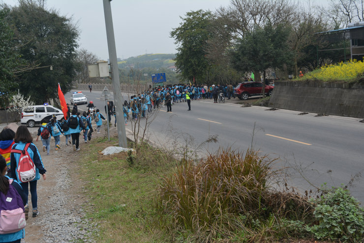 此次活动正值初春,户外空气清新,春风吹拂,四处油菜花香。各班队伍的最前端班旗飘扬,同学们精力活泼,在路上纷纷拍照留念,一路上欢声笑语。下午的回程中同学们显现疲惫姿态,速度也有所减慢,为此有的同学唱起歌曲来转移注意力,驱赶走腿脚的疼痛感,也使漫长的路途变得丰富多彩。