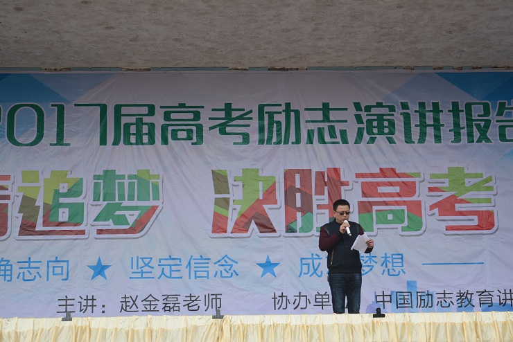 2016年11月5日下午,我校于运动场举办了主题为“激情追梦、决胜高考”的高三励志讲座。本次演讲由中国励志教育讲学团金牌讲师赵老师主讲,冯丹东校长首先发表了讲话,并致欢迎辞。在讲座中,赵老师对台下的高三学生们进行了充满激情的鼓舞,引来阵阵欢笑声和掌声。我校高三教师刘明权老师也参与了互动,对学生们作出了真情告白。此次演讲气氛热烈、效果显著,取得了圆满成功。