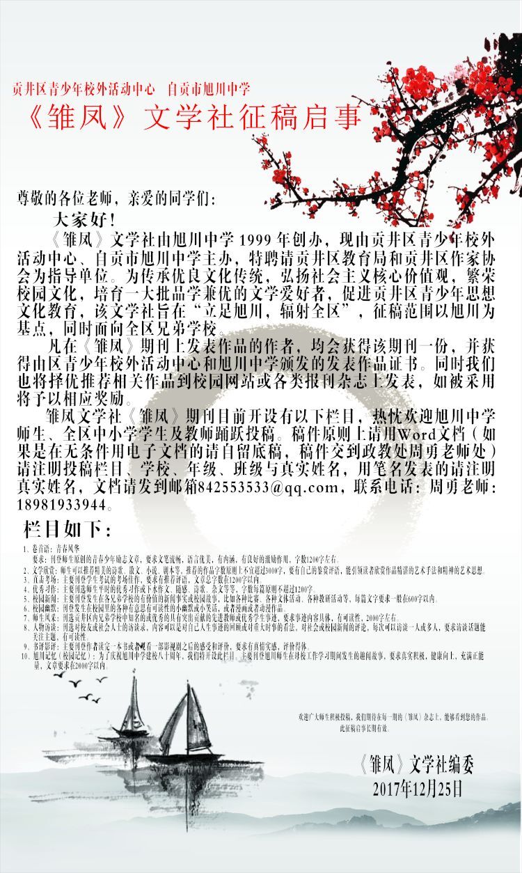 雏凤文学社《雏凤》期刊目前开设有以下栏目,热忱欢迎旭川中学师生、全区中小学学生及教师踊跃投稿。稿件原则上请用Word文档(如果是在无条件用电子文档的请自留底稿,稿件交到政教处周勇老师处)请注明投稿栏目、学校、年级、班级与真实姓名,用笔名发表的请注明真实姓名,文档请发到邮箱842553533@qq.com,联系电话:周勇老师:18981933944。