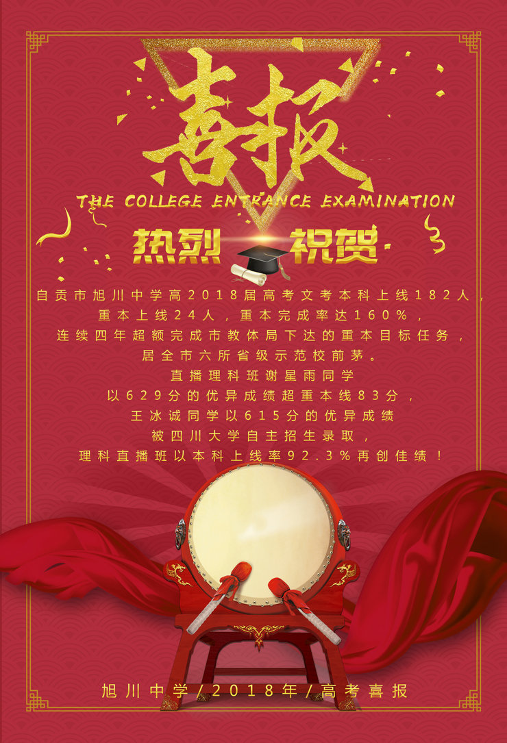 自贡市旭川中学高2018届高考文考本科上线182人,重本上线24人,重本完成率达160%,连续四年超额完成市教体局下达的重本目标任务,居全市六所省级示范校前茅。直播理科班谢星雨同学以629分的优异成绩超重本线83分,王冰诚同学以615分的优异成绩被四川大学自主招生录取,理科直播班以本科上线率92.3%再创佳绩。特向大家报喜并感谢大家对旭川中学的关心、厚爱和支持。