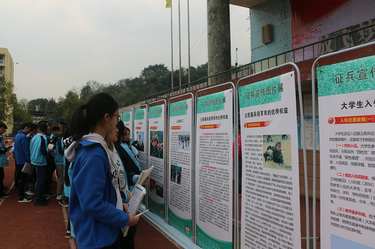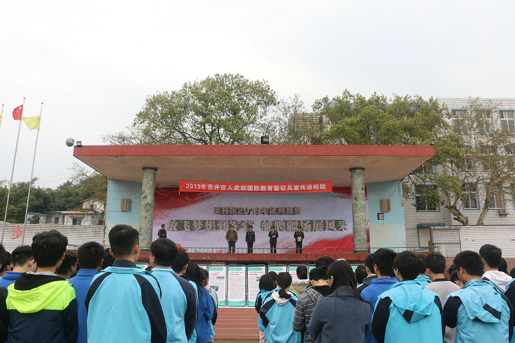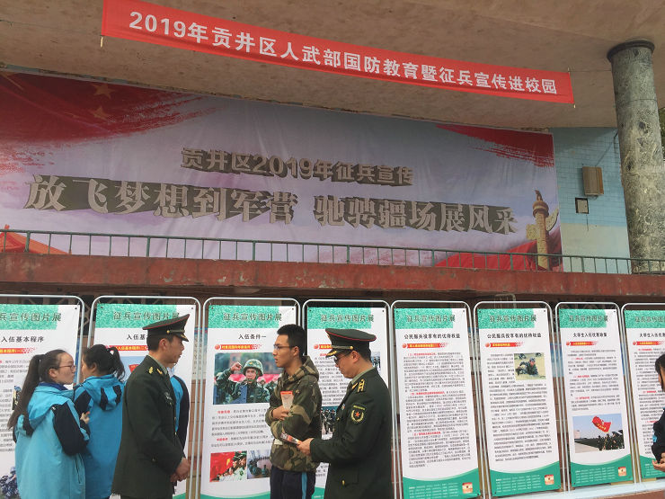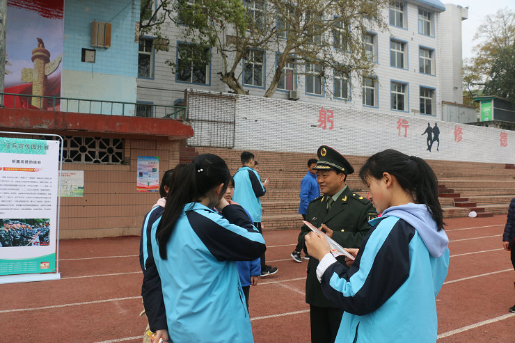 3月19日下午,贡井区人武部走进旭川校园,在我校高三年级学生中开展了“国防教育暨征兵宣传进校园”宣教活动。区人武部赵政委就当今我国强大的国防力量,国际军事形势,以及应届高中毕业生报名参军的条件和要求、优抚待遇等问题向学生们进行了讲解。学生们就自己关心的国防和服兵役相关疑问向人武部官兵进行了咨询。