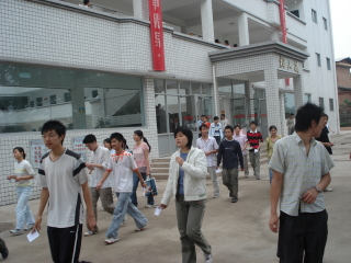 高06级学生轻松考完第一科——语文,正陆续走出考场。