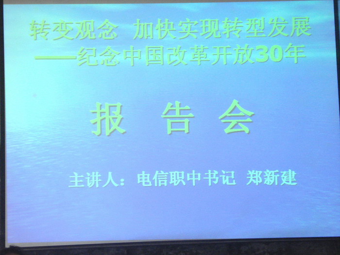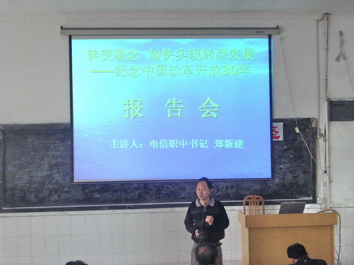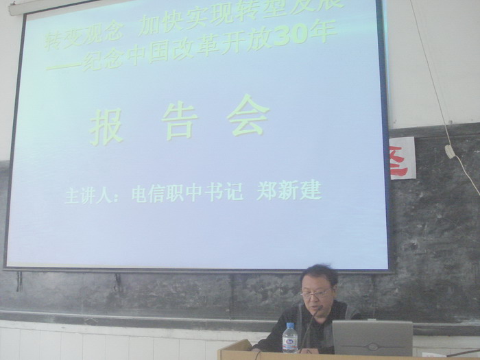 2008年4月22日下午,旭川中学邀请电信职中书记郑新建为全体教师作题为“转变观念加快实现转型发展——纪念中国改革开放发展30年”的报告。(党政办)