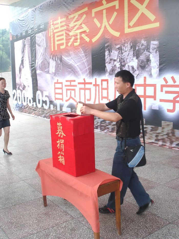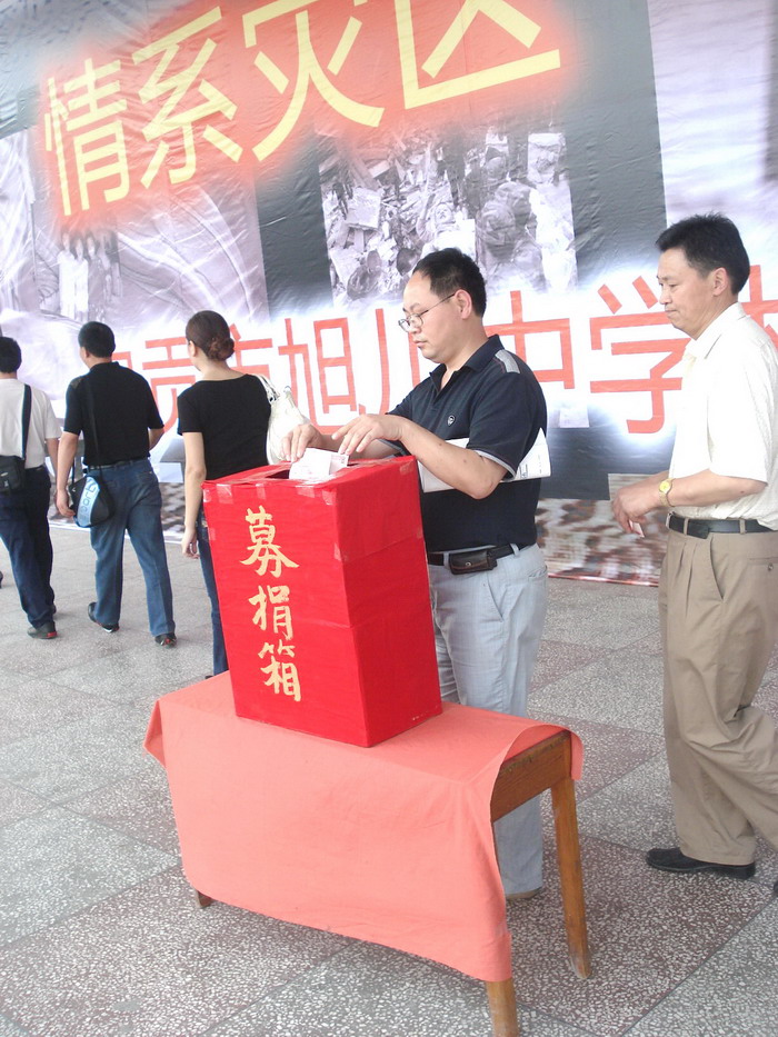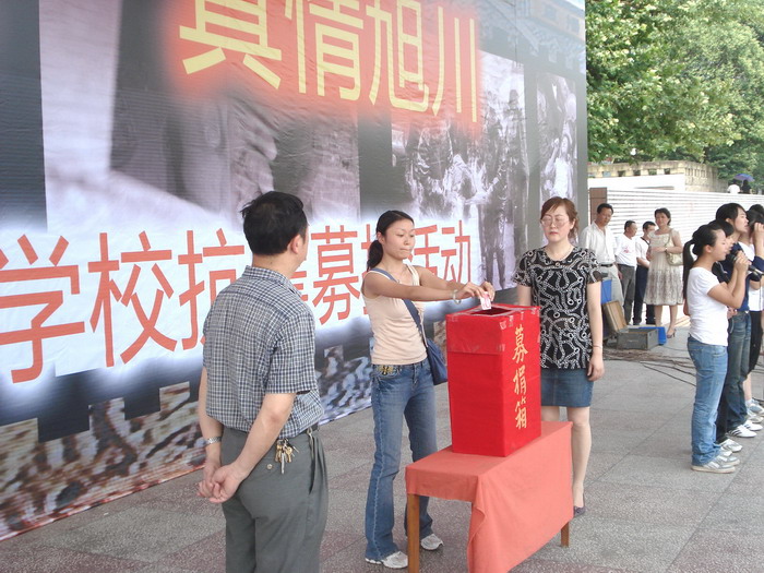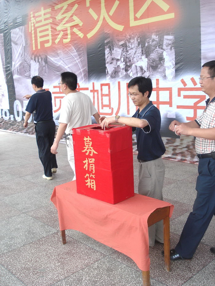 2008年5月19日下午2:20,在区教育局党组书记、局长吴晓宁和我校党政工领导的带领下,举行了“情系灾区 真情旭川”抗震募捐活动,全校师生员工都积极响应号召,捐款金额达到73,957.32元(其中,区教育局领导和广大教职工捐款共计:17,190.00元,学生捐款共计:56,767.32元)。(党政办)